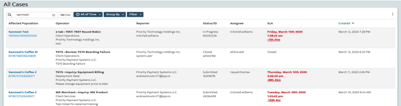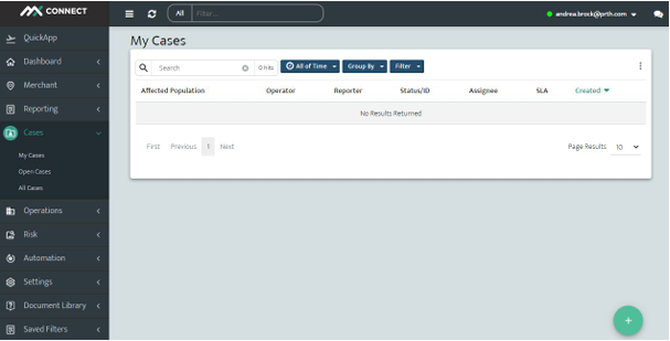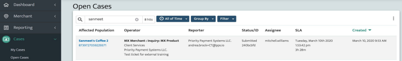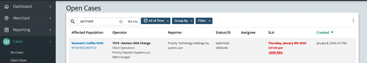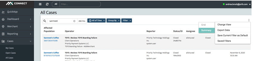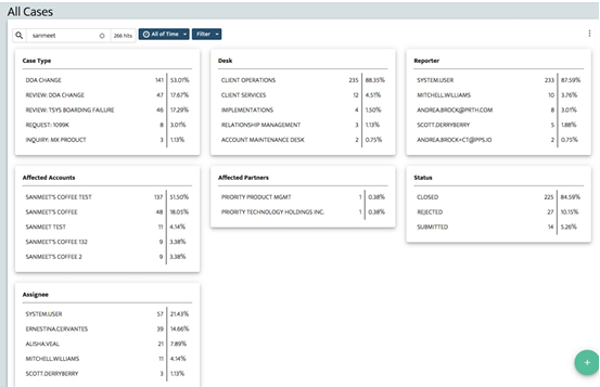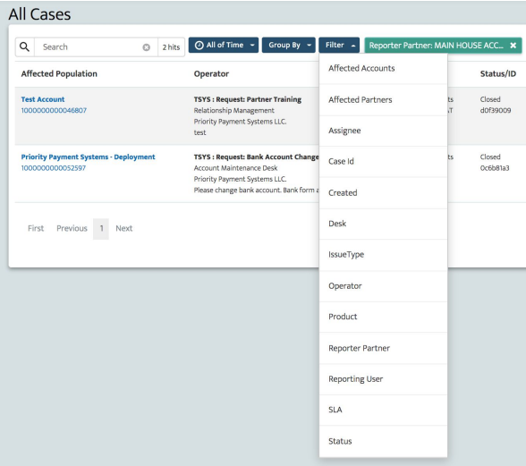 Filtering by Affected Accounts allows users to view all cases associated with a specific merchant.