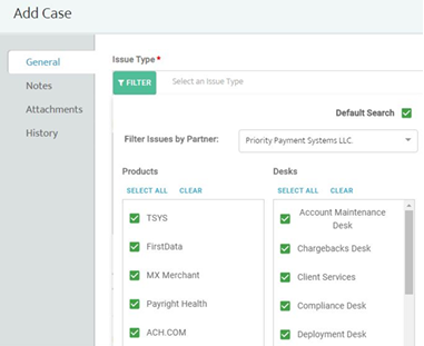 - Issue Types are based on the selected processor (TSYS or Fiserv)